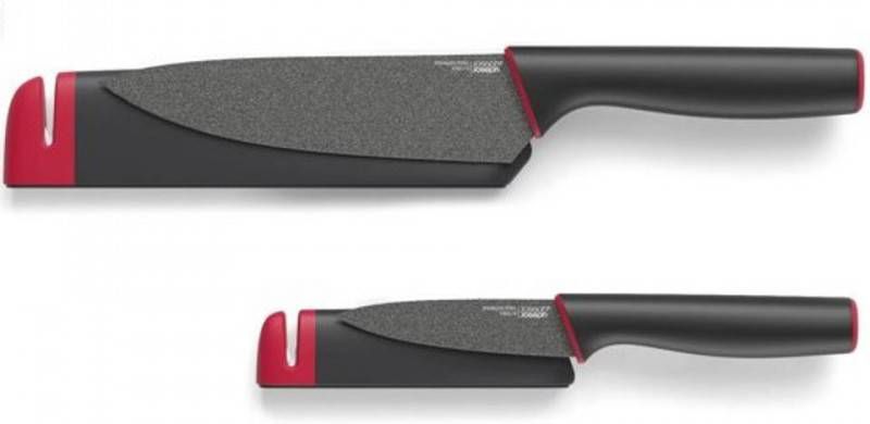 Slice & Sharpen messenset 2-delig van het merk Joseph Joseph- Deze all-in-one messen hebben een anti-kleef, siliconen coated mesoppervlak en een beschermhoes met geïntegreerde messenslijper- Hierdoor kan voor gebruik het mes geslepen worden- De beschermhoes bevat een anti-slip voet zodat het niet weg kan glijden tijdens het slijpen- Niet vaatwasmachinebestendig-.